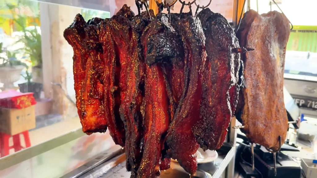 Each piece is then marinated in a secret blend of honey, soy sauce, maltose, and aromatic spices. This marinade isn’t rushed; it’s slowly absorbed into the meat to build deep flavor. Once ready, the slabs are hung inside a custom charcoal oven, where the real magic begins. The heat from the burning charcoal creates that iconic smoky glaze, while the constant basting gives the char siu its shiny “glass-like” finish. 🤩